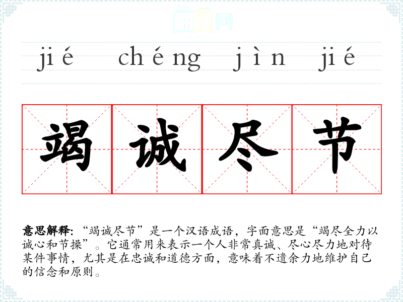 “竭诚尽节”是一个汉语成语,字面意思是“竭尽全力以诚心和节操”。它通常用来表示一个人非常真诚、尽心尽力地对待某件事情,尤其是在忠诚和道德方面,意味着不遗余力地维护自己的信念和原则。