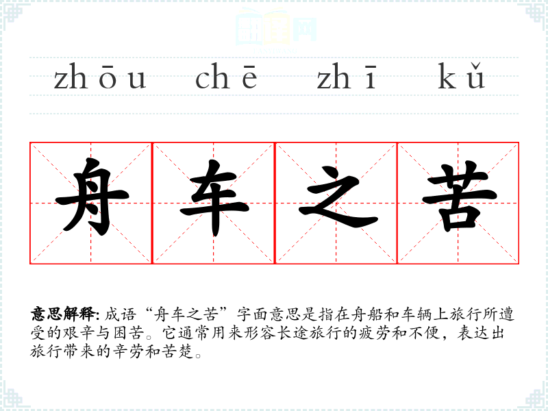 成语“舟车之苦”字面意思是指在舟船和车辆上旅行所遭受的艰辛与困苦。它通常用来形容长途旅行的疲劳和不便,表达出旅行带来的辛劳和苦楚。