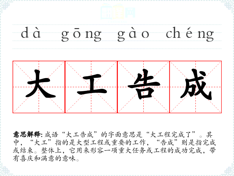 成语“大工告成”的字面意思是“大工程完成了”。其中,“大工”指的是大型工程或重要的工作,“告成”则是指完成或结束。整体上,它用来形容一项重大任务或工程的成功完成,带有喜庆和满意的意味。