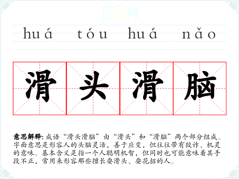 成语“滑头滑脑”由“滑头”和“滑脑”两个部分组成。字面意思是形容人的头脑灵活,善于应变,但往往带有狡诈、机灵的意味。基本含义是指一个人聪明机智,但同时也可能意味着其手段不正,常用来形容那些擅长耍滑头、耍花招的人。