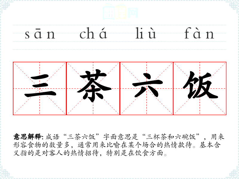 成语“三茶六饭”字面意思是“三杯茶和六碗饭”,用来形容食物的数量多,通常用来比喻在某个场合的热情款待。基本含义指的是对客人的热情招待,特别是在饮食方面。