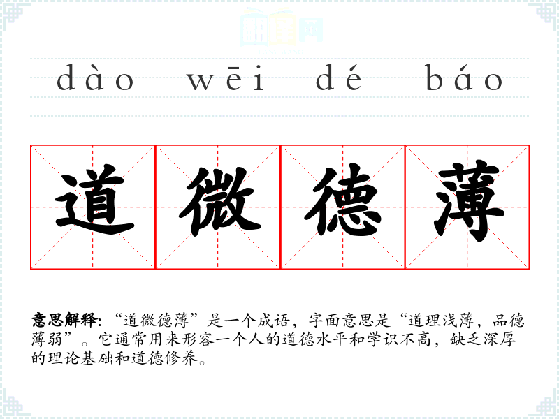 “道微德”是一个成语,字面意思是“道理浅,品德*弱”。它通常用来形容一个人的道德水平和学识不高,缺乏深厚的理论基础和道德修养。