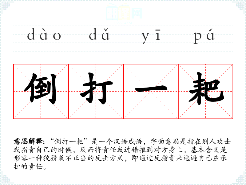“倒打一耙”是一个汉语成语,字面意思是指在别人攻击或指责自己的时候,反而将责任或过错推到对方身上。基本含义是形容一种狡猾或不正当的反击方式,即通过反指责来逃避自己应承担的责任。