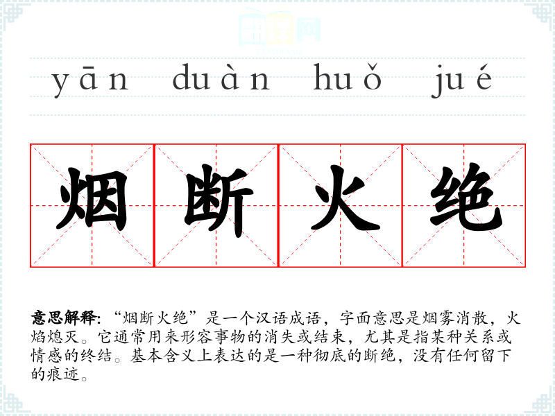 “烟断火绝”的来源并没有明确的历史典故,但可以推测其形成与传统文化中对火和烟的象征意义有关。火象征着热情、生命和希望,而烟则常常被视为短暂、消逝的象征。因此,成语的使用常常暗示着一种情感或事物的彻底消失。