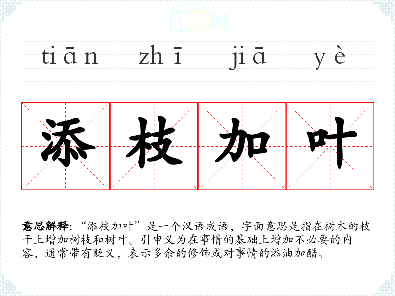 “添枝加叶”是一个汉语成语,字面意思是指在树木的枝干上增加树枝和树叶。引申义为在事情的基础上增加不必要的内容,通常带有贬义,表示多余的修饰或对事情的添油加醋。