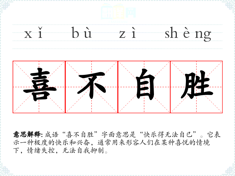 成语“喜不自胜”字面意思是“快乐得无法自已”。它表示一种极度的快乐和兴奋,通常用来形容人们在某种喜悦的情境下,情绪失控,无法自我抑制。