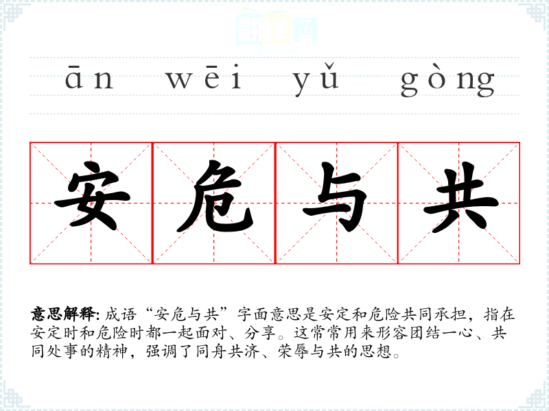 成语“安危与共”字面意思是安定和危险共同承担,指在安定时和危险时都一起面对、分享。这常常用来形容团结一心、共同处事的精神,强调了同舟共济、荣辱与共的思想。