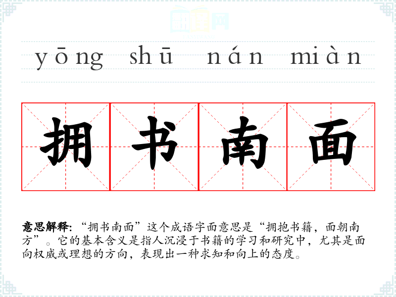 “拥书南面”这个成语字面意思是“拥抱书籍,面朝南方”。它的基本含义是指人沉浸于书籍的学*和研究中,尤其是面向权威或理想的方向,表现出一种求知和向上的态度。
