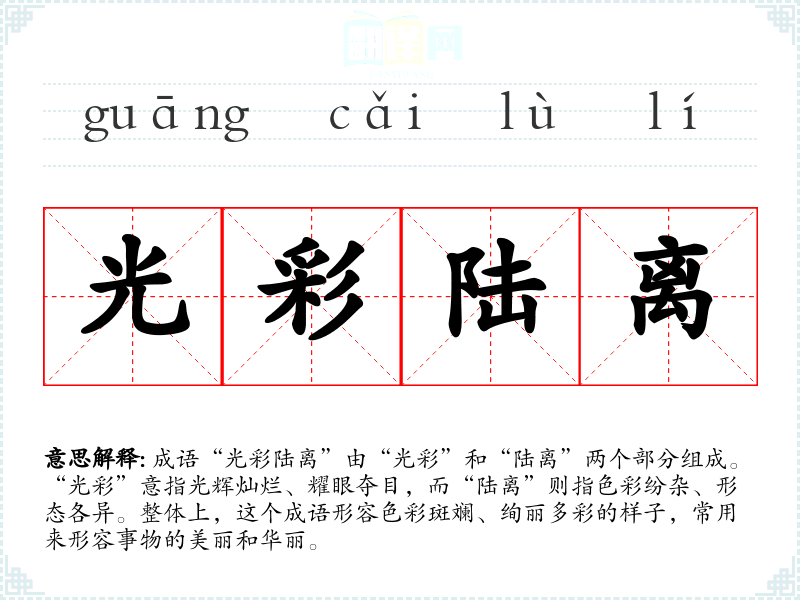 成语“光彩陆离”由“光彩”和“陆离”两个部分组成。“光彩”意指光辉灿烂、耀眼夺目,而“陆离”则指色彩纷杂、形态各异。整体上,这个成语形容色彩斑斓、绚丽多彩的样子,常用来形容事物的美丽和华丽。