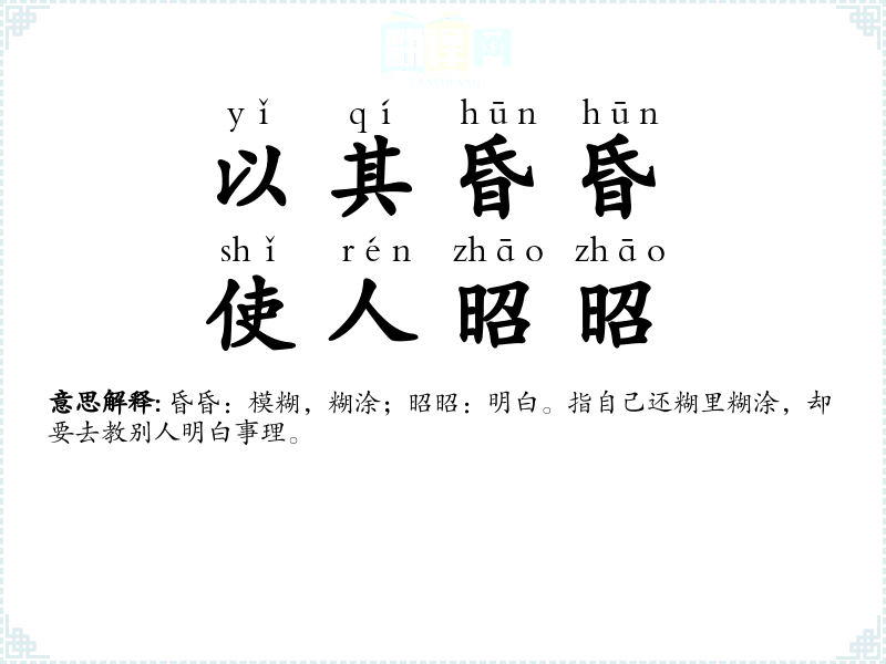 昏昏:模糊,糊涂;昭昭:明白。指自己还糊里糊涂,却要去教别人明白事理。 |