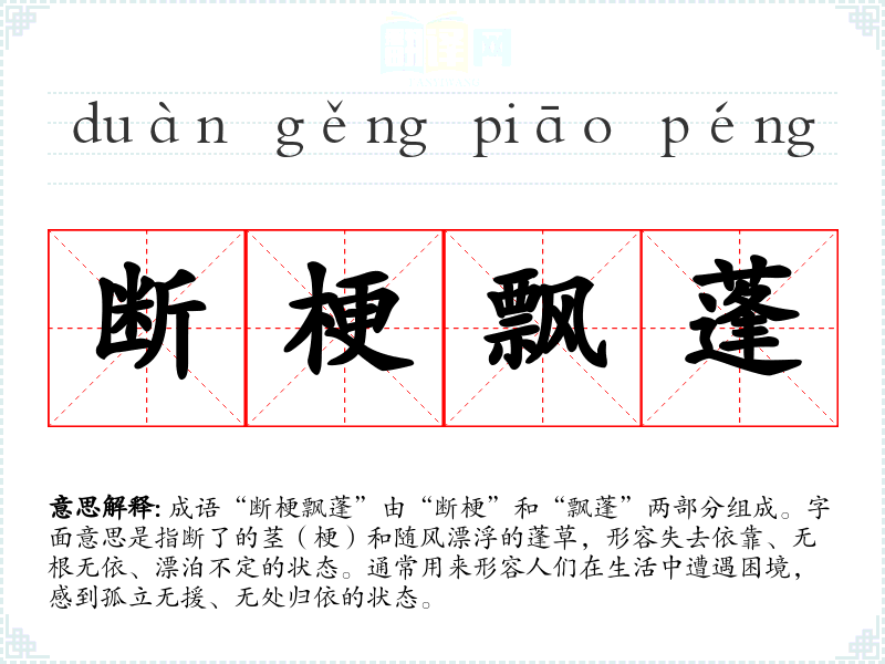 在文学作品中,“断梗飘蓬”常用来描绘人物的孤独与无助,或者形容社会动荡时期人们的漂泊状态。在日常对话中,也可以用来形容某人经历巨变后失去方向感,比如失业、离婚等场景,而在演讲中则可用来引入对社会问题的讨论,强调个体在大环境中的无奈。