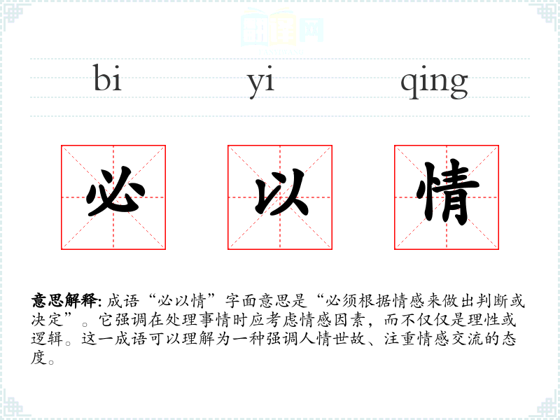 “必以情”并不是一个传统的成语,而是一个现代汉语中常用的表达,可能源于对人际关系和情感的重视。在传统文化中,人与人之间的关系往往受到情感因素的影响,例如儒家文化强调的“仁、义、礼、智、信”,其中情感在社会互动中占据重要地位。
