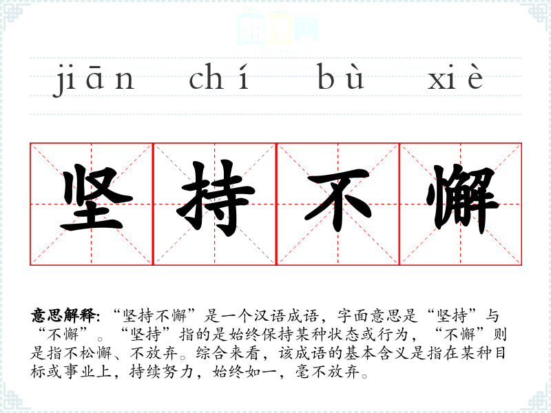 “坚持不懈”是一个汉语成语,字面意思是“坚持”与“不懈”。“坚持”指的是始终保持某种状态或行为,“不懈”则是指不松懈、不放弃。综合来看,该成语的基本含义是指在某种目标或事业上,持续努力,始终如一,毫不放弃。