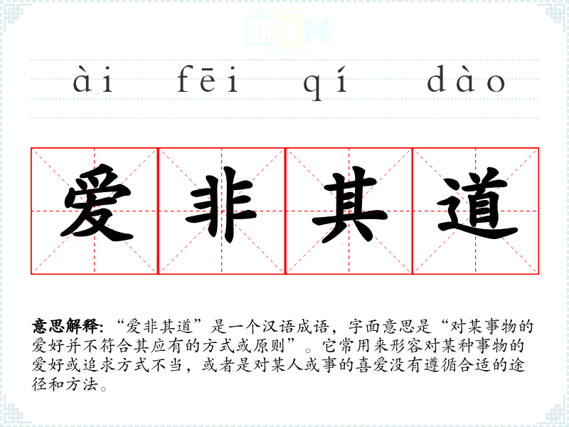 “爱非其道”是一个汉语成语,字面意思是“对某事物的爱好并不符合其应有的方式或原则”。它常用来形容对某种事物的爱好或追求方式不当,或者是对某人或事的喜爱没有遵循合适的途径和方法。