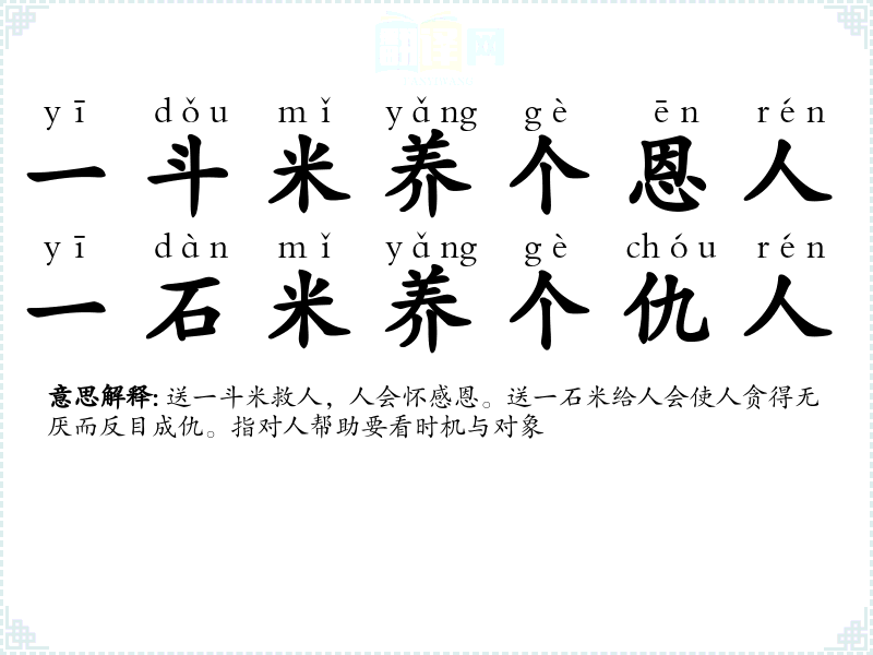 送一斗米救人,人会怀感恩。送一石米给人会使人贪得无厌而反目成仇。指对人帮助要看时机与对象 |