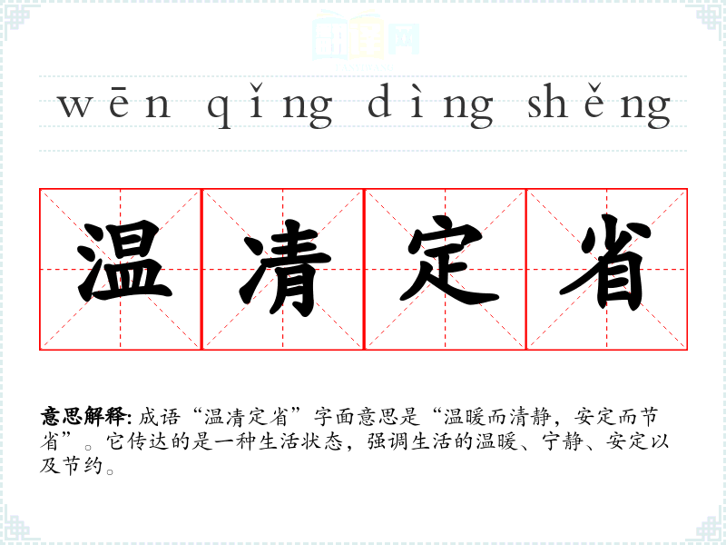成语“温凊定省”字面意思是“温暖而清静,安定而节省”。它传达的是一种生活状态,强调生活的温暖、宁静、安定以及节约。