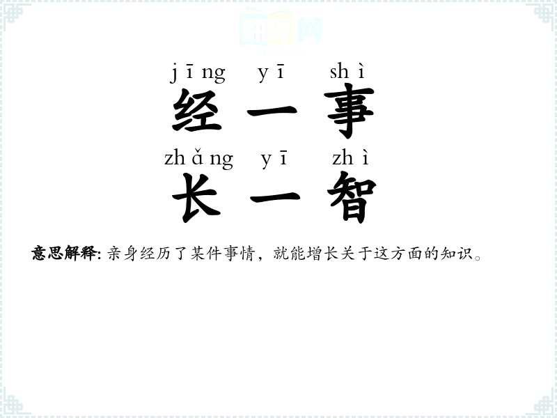| 不经一事,不长一智 | 智:智慧,见识。不经历一件事情,就不能增长对那件事情的见识。 |