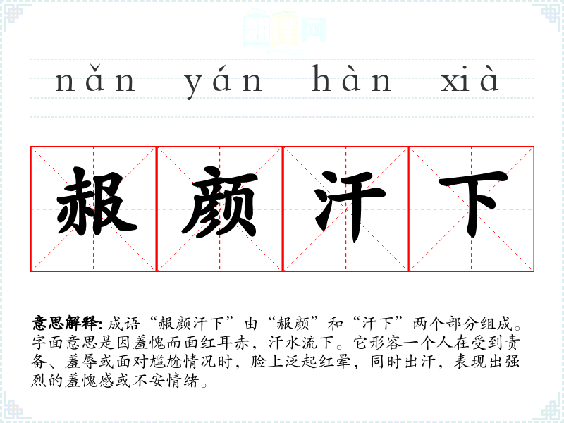 成语“赧颜汗下”由“赧颜”和“汗下”两个部分组成。字面意思是因羞愧而面红耳赤,汗水流下。它形容一个人在受到责备、羞辱或面对尴尬情况时,脸上泛起红晕,同时出汗,表现出强烈的羞愧感或不安情绪。