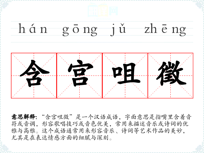 “含宫咀徵”是一个汉语成语,字面意思是指嘴里含着音符或音调,形容歌唱技巧或音色优美,常用来描述音乐或诗词的优雅与高雅。这个成语通常用来形容音乐、诗词等艺术作品的美妙,尤其是在表达情感方面的细腻与深刻。