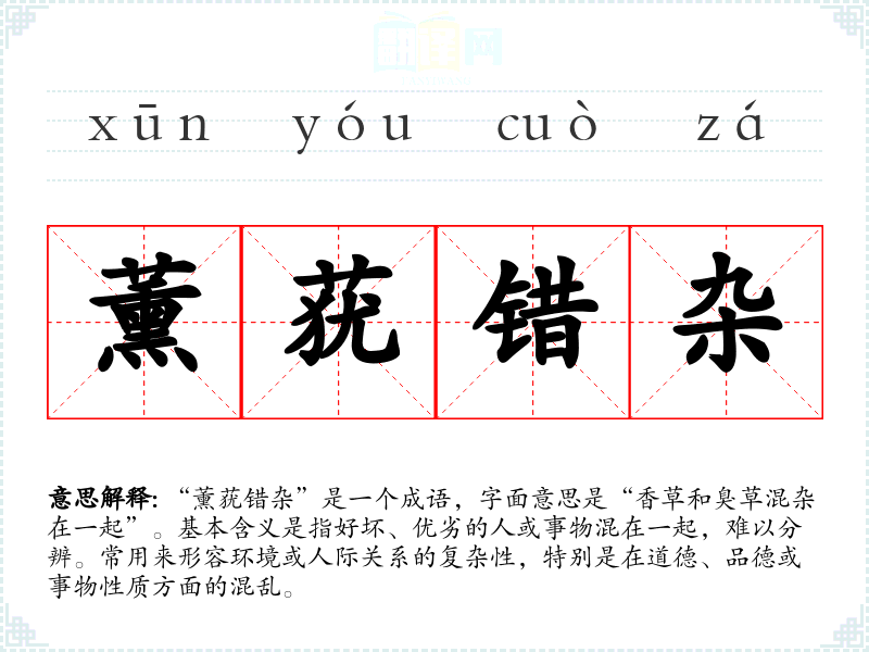 “薰莸错杂”是一个成语,字面意思是“香草和臭草混杂在一起”。基本含义是指好坏、优劣的人或事物混在一起,难以分辨。常用来形容环境或人际关系的复杂性,特别是在道德、品德或事物性质方面的混乱。