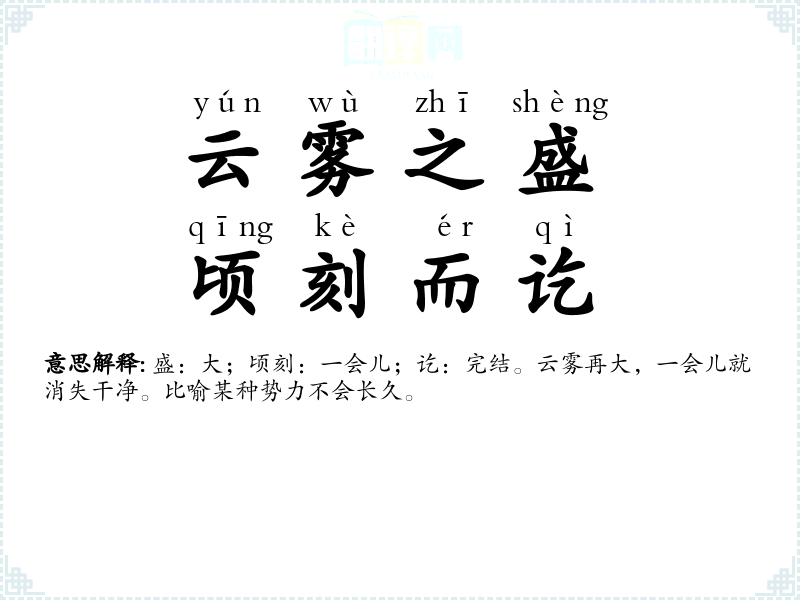 盛:大;顷刻:一会儿;讫:完结。云雾再大,一会儿就消失干净。比喻某种势力不会长久。 |