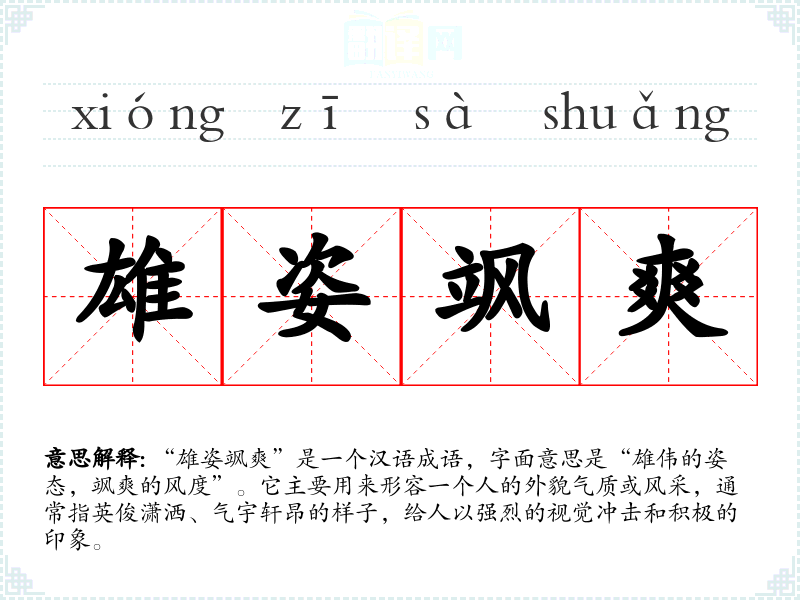 “雄姿飒爽”这个成语给人一种积极向上的情感反应。它不仅仅是外貌的描绘,更是一种内在气质的体现,联想到勇敢、决心和自信,能够激励人们追求自我提升和表现。