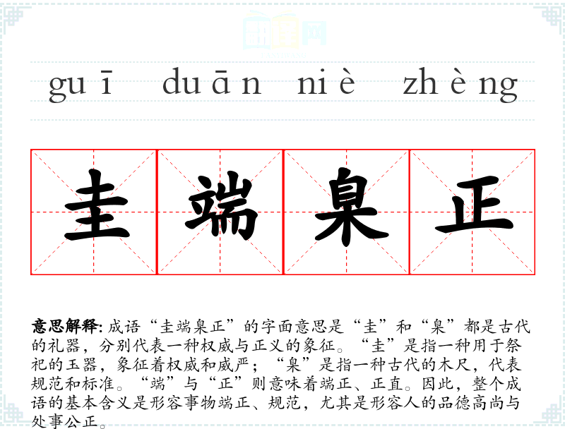 成语“圭端臬正”的字面意思是“圭”和“臬”都是古代的礼器,分别代表一种权威与正义的象征。“圭”是指一种用于祭祀的玉器,象征着权威和威严;“臬”是指一种古代的木尺,代表规范和标准。“端”与“正”则意味着端正、正直。因此,整个成语的基本含义是形容事物端正、规范,尤其是形容人的品德高尚与处事公正。