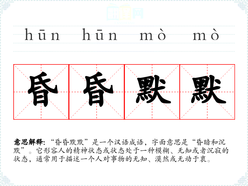 | 昏昏默默 | ①看不见听不到的状态。指至道难见莫测。②迷糊,不知所以。 |