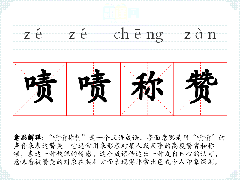 “啧啧称赞”并没有明确的古代典故或文学出处,而是由常见的口头表达演变而来。汉语中“啧啧”是模仿声音的拟声词,多用于表示惊叹或赞美。成语的形成反映了人们对赞美表达的需求,常常出现在对艺术、才华、品德等方面的评价中。