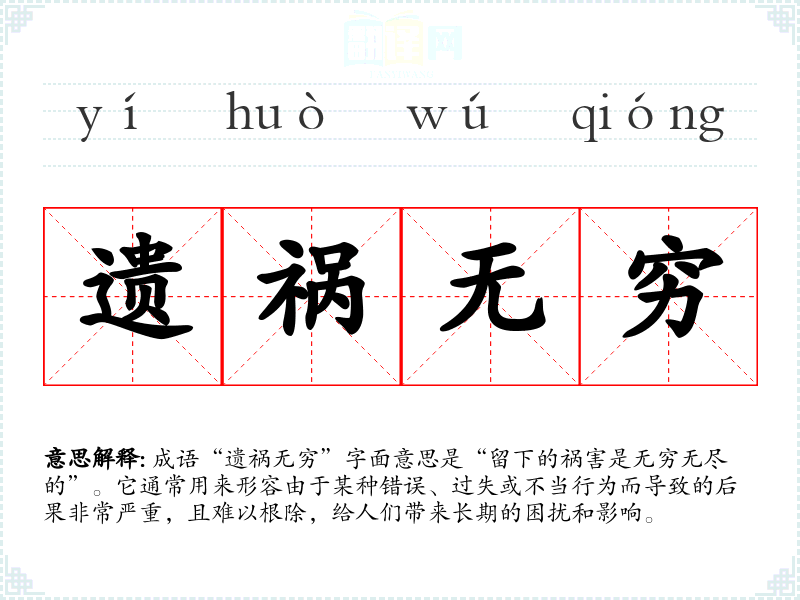 成语“遗祸无穷”字面意思是“留下的祸害是无穷无尽的”。它通常用来形容由于某种错误、过失或不当行为而导致的后果非常严重,且难以根除,给人们带来长期的困扰和影响。