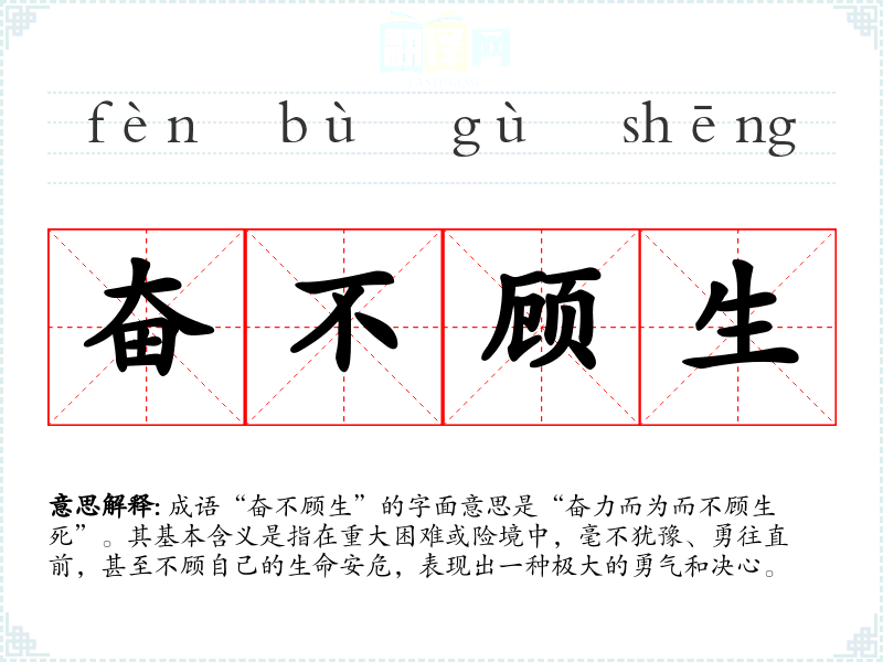 成语“奋不顾生”的字面意思是“奋力而为而不顾生死”。其基本含义是指在重大困难或险境中,毫不犹豫、勇往直前,甚至不顾自己的生命安危,表现出一种极大的勇气和决心。