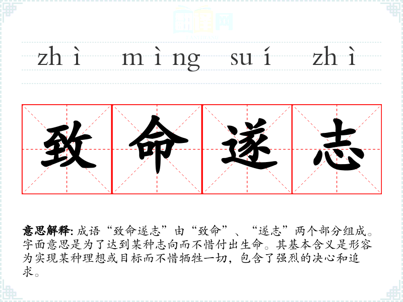 成语“致命遂志”由“致命”、“遂志”两个部分组成。字面意思是为了达到某种志向而不惜付出生命。其基本含义是形容为实现某种理想或目标而不惜牺牲一切,包含了强烈的决心和追求。