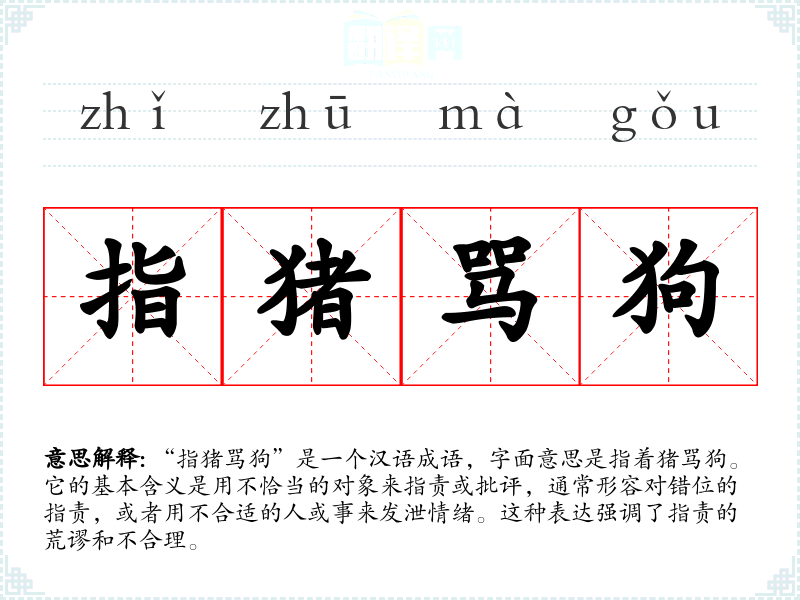 - “冤屈无辜”:指对没有错的人进行指责,和“指猪骂狗”有相似的意思。