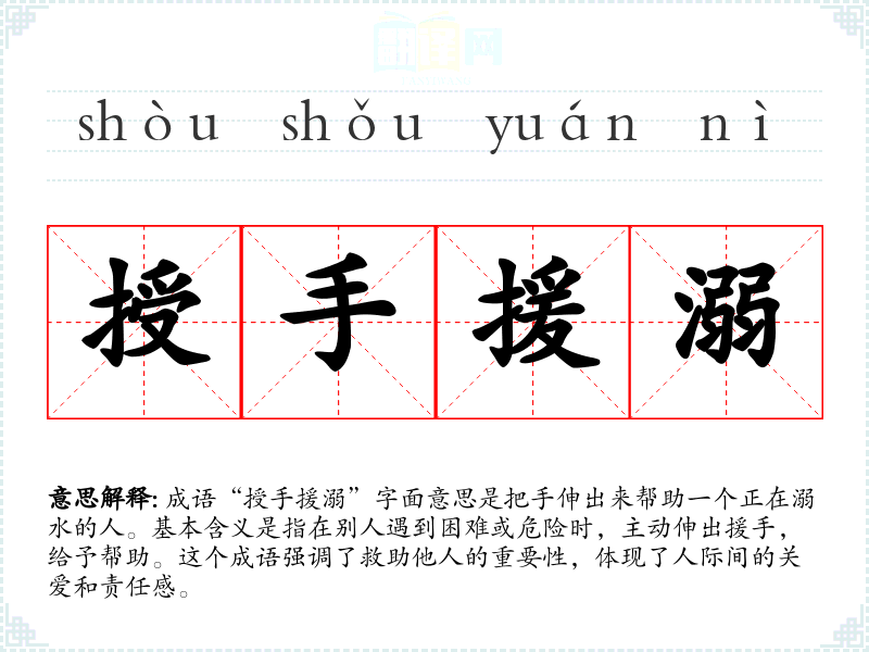 成语“授手援溺”字面意思是把手伸出来帮助一个正在溺水的人。基本含义是指在别人遇到困难或危险时,主动伸出援手,给予帮助。这个成语强调了救助他人的重要性,体现了人际间的关爱和责任感。
