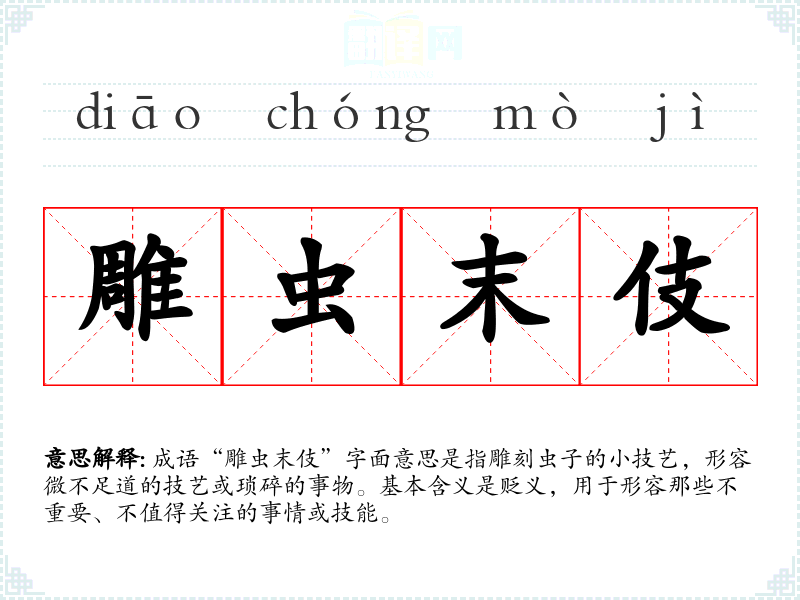 成语“雕虫末伎”字面意思是指雕刻虫子的小技艺,形容微不足道的技艺或琐碎的事物。基本含义是贬义,用于形容那些不重要、不值得关注的事情或技能。