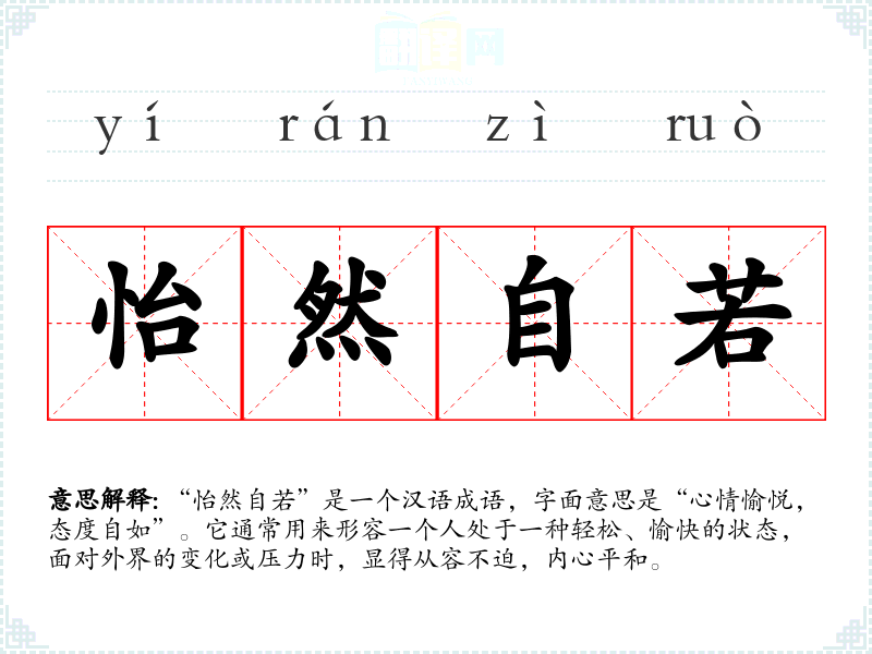 “怡然自若”是一个汉语成语,字面意思是“心情愉悦,态度自如”。它通常用来形容一个人处于一种轻松、愉快的状态,面对外界的变化或压力时,显得从容不迫,内心平和。