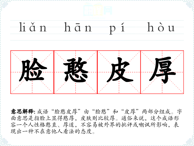 成语“脸憨皮厚”由“脸憨”和“皮厚”两部分组成。字面意思是指脸上显得憨厚,皮肤则比较厚。通俗来说,这个成语形容一个人性格憨直、厚道,不容易被外界的批评或嘲讽所影响,表现出一种不在意他人看法的态度。