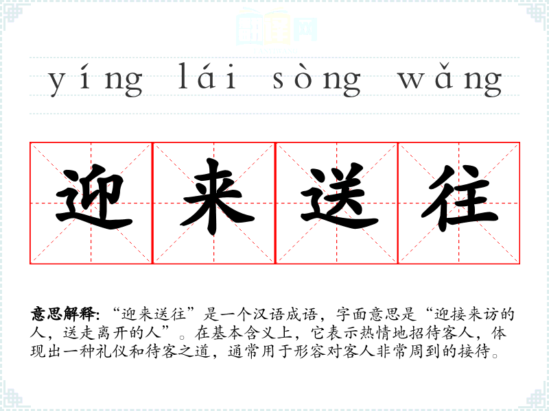 “迎来送往”是一个汉语成语,字面意思是“迎接来访的人,送走离开的人”。在基本含义上,它表示热情地招待客人,体现出一种礼仪和待客之道,通常用于形容对客人非常周到的接待。