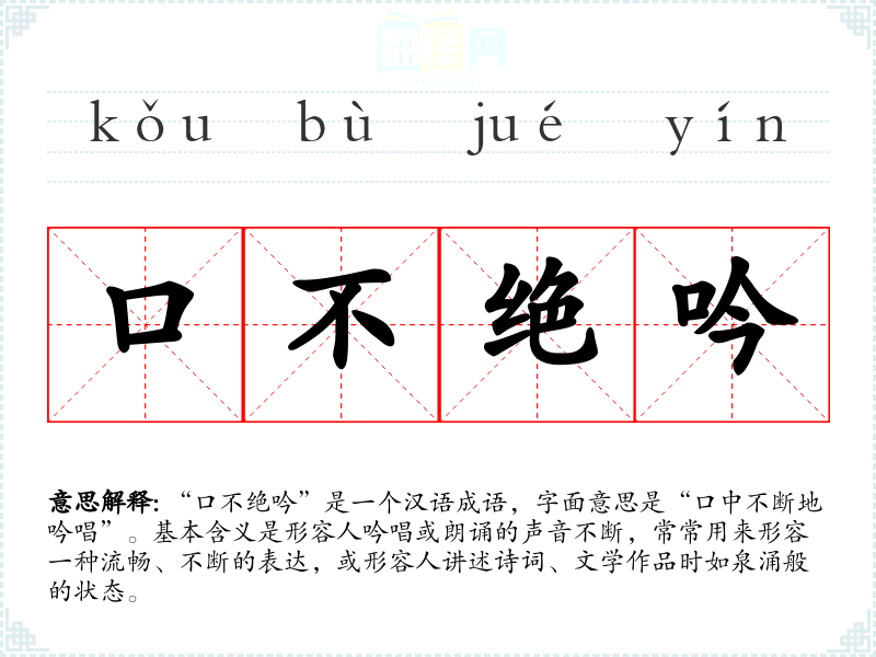 “口不绝吟”是一个汉语成语,字面意思是“口中不断地吟唱”。基本含义是形容人吟唱或朗诵的声音不断,常常用来形容一种流畅、不断的表达,或形容人讲述诗词、文学作品时如泉涌般的状态。