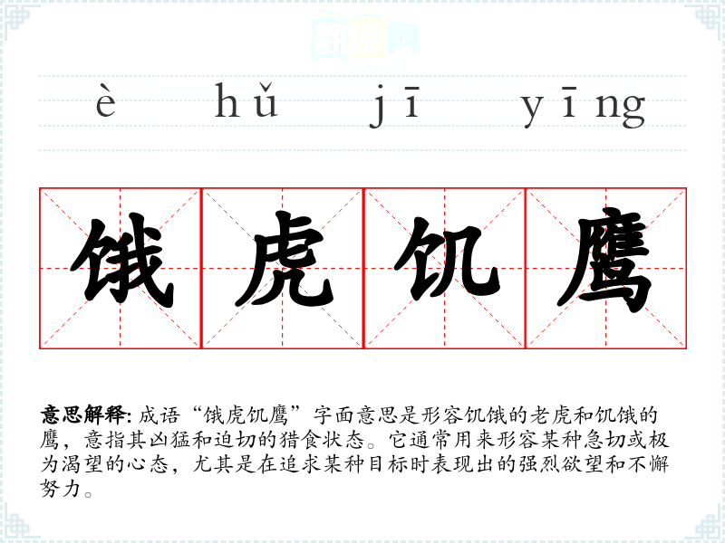 成语“饿虎饥鹰”字面意思是形容饥饿的**和饥饿的鹰,意指其凶猛和迫切的猎食状态。它通常用来形容某种急切或极为渴望的心态,尤其是在追求某种目标时表现出的强烈欲望和不懈努力。