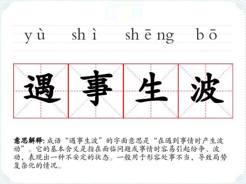 成语“遇事生波”的字面意思是“在遇到事情时产生波动”。它的基本含义是指在面临问题或事情时容易引起纷争、波动,表现出一种不安定的状态。一般用于形容处事不当,导致局势复杂化的情况。