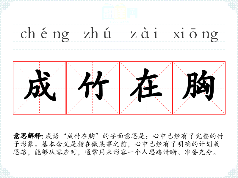 成语“成竹在胸”的字面意思是:心中已经有了完整的竹子形象。基本含义是指在做某事之前,心中已经有了明确的计划或思路,能够从容应对,通常用来形容一个人思路清晰、准备充分。