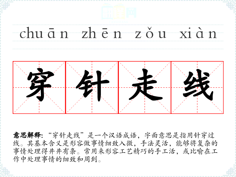 - 日常对话:在朋友之间讨论某项细致的工作时可以使用,比如“她做的手工艺品真是穿针走线,特别好看。”
