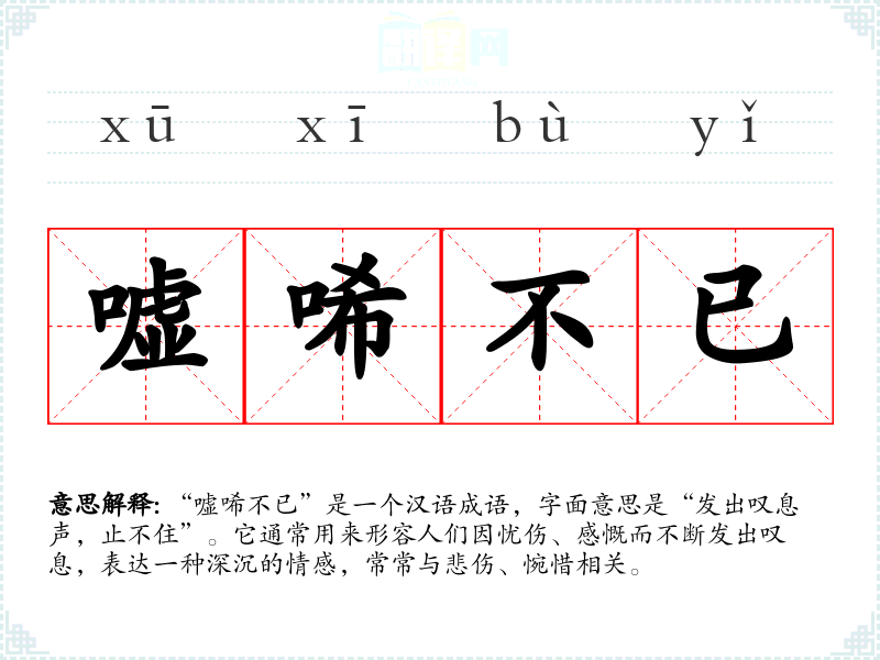 “嘘唏不已”是一个汉语成语,字面意思是“发出叹息声,止不住”。它通常用来形容人们因忧伤、感慨而不断发出叹息,表达一种深沉的情感,常常与悲伤、惋惜相关。