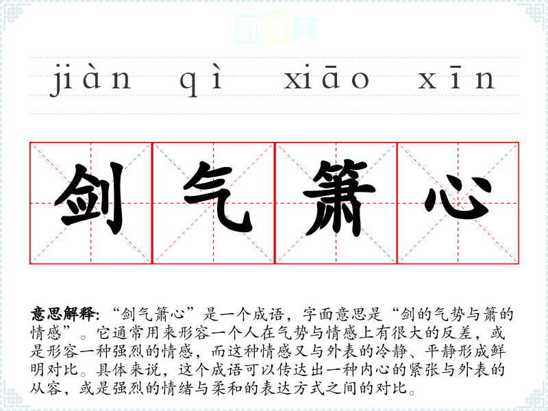 “剑气箫心”是一个成语,字面意思是“剑的气势与箫的情感”。它通常用来形容一个人在气势与情感上有很大的反差,或是形容一种强烈的情感,而这种情感又与外表的冷静、平静形成鲜明对比。具体来说,这个成语可以传达出一种内心的紧张与外表的从容,或是强烈的情绪与柔和的表达方式之间的对比。
