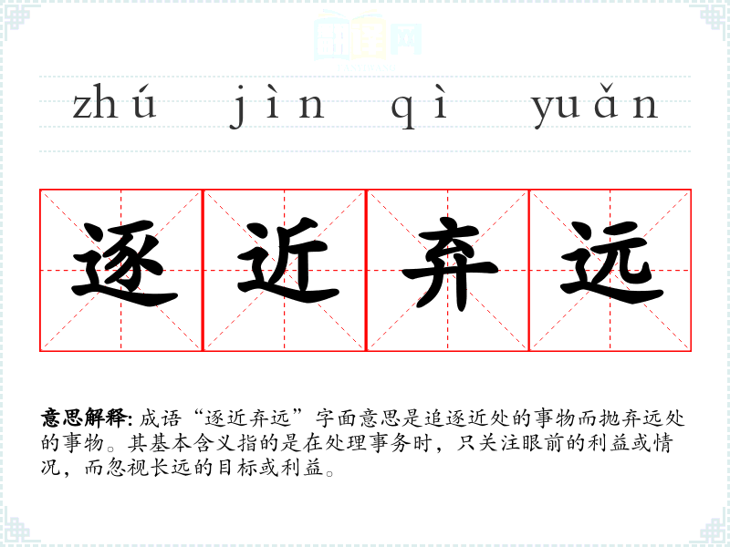 成语“逐近弃远”字面意思是追逐近处的事物而抛弃远处的事物。其基本含义指的是在处理事务时,只关注眼前的利益或情况,而忽视长远的目标或利益。
