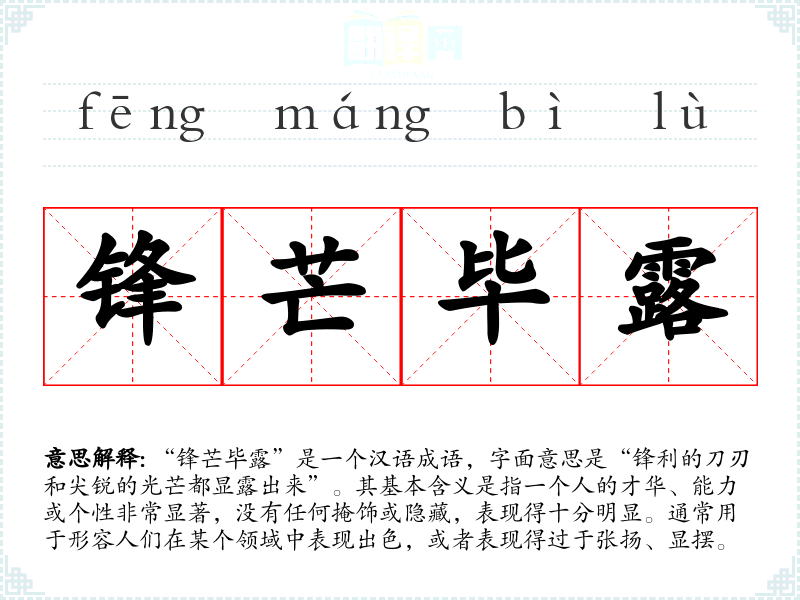 | 锋铓毕露 | 锐气和才华全都显露出来。多指人好表现自己。同“锋芒毕露”。 |