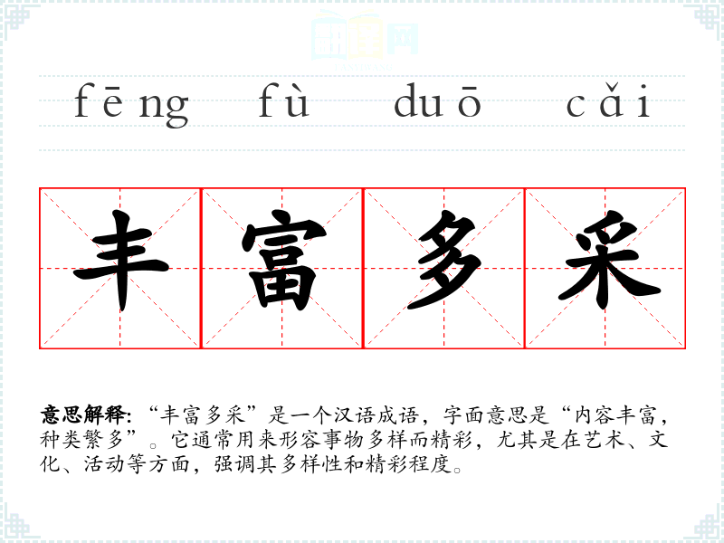 “丰富多采”是一个汉语成语,字面意思是“内容丰富,种类繁多”。它通常用来形容事物多样而精彩,尤其是在艺术、文化、活动等方面,强调其多样性和精彩程度。
