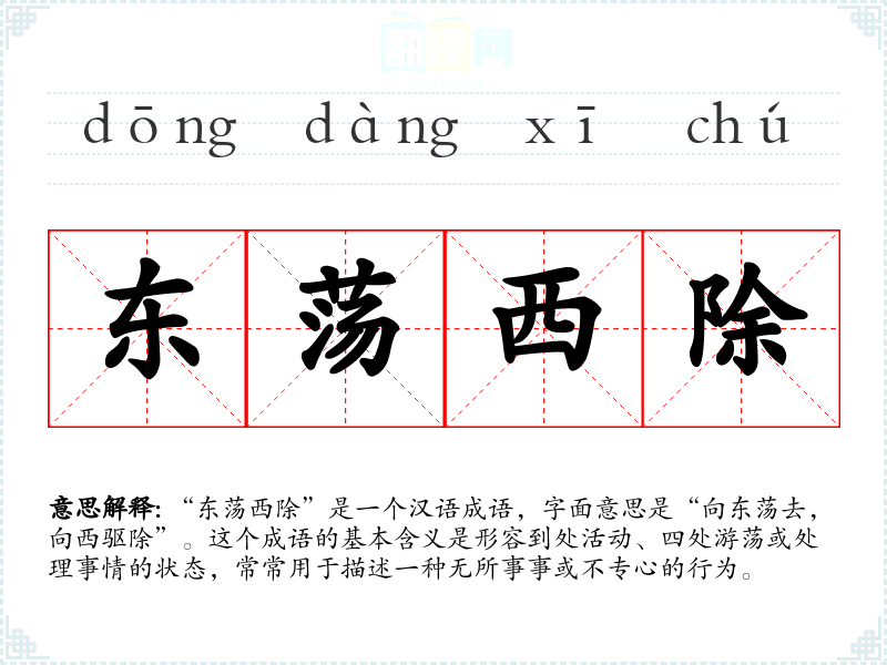 “东荡西除”是一个汉语成语,字面意思是“向东荡去,向西驱除”。这个成语的基本含义是形容到处活动、四处游荡或处理事情的状态,常常用于描述一种无所事事或不专心的行为。
