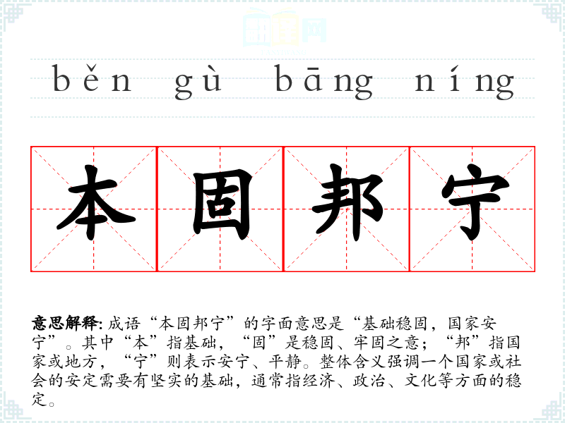 成语“本固邦宁”的字面意思是“基础稳固,国家安宁”。其中“本”指基础,“固”是稳固、牢固之意;“邦”指国家或地方,“宁”则表示安宁、平静。整体含义强调一个国家或社会的安定需要有坚实的基础,通常指经济、政治、文化等方面的稳定。